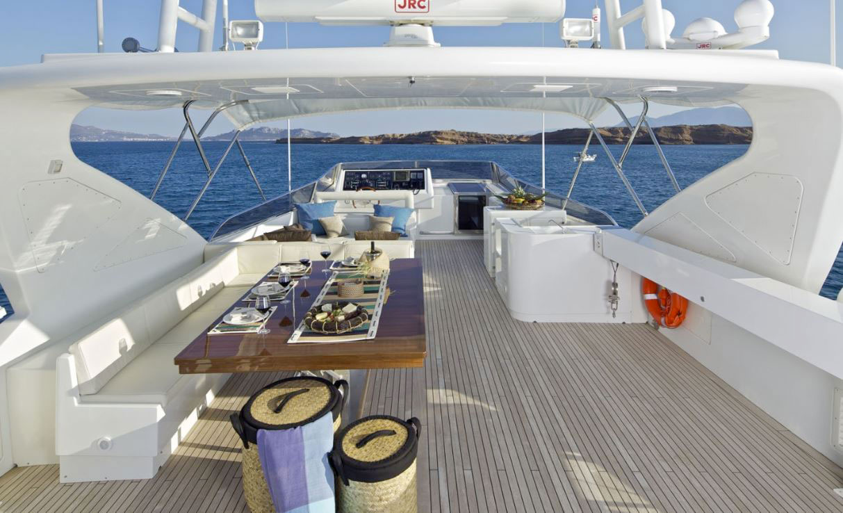 Helios is a beautiful 35 meter Falcon for charter in Greece. This motor yacht was built in 2010 by the renowned Falcon shipyard. In recent years the yacht has undergone many refit works. With its elegant interior design, unique exterior line, discreet lighting, numerous amenities, water features and its fantastic crew, sailing will be truly incredible. As soon as you get on you find yourself on the large, wide and spacious stern platform with a light wooden table, surrounded by 10/12 chairs. The yacht has an invitingly sized platform with shower, solarium, I-Pod docking station, 42″ flat screen TV, hi-fi system, DVD player and Home Cinema system. The sun deck has many spaces where you can relax and enjoy your holiday: a fully equipped bar area, sun loungers. At the bow we find a comfortable sunbathing area.