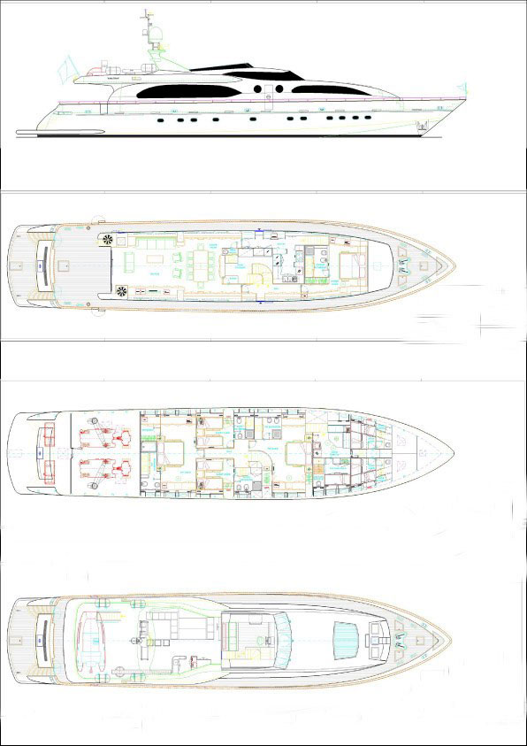 The yacht accomodate up to 12 guests in 5 cabins: one VIP cabin on the main deck aft with walk-in wardrobe, minibar and safe, one Master cabin on lower deck with desk, walk-in wardrobe, minibar and safe, one VIP cabin on the lower deck fore, wardrobe and safe, two Twin cabins on the lower deck with one Pullman berth in each, 2 safes and wardrobe, all cabins with en-suite facilities.