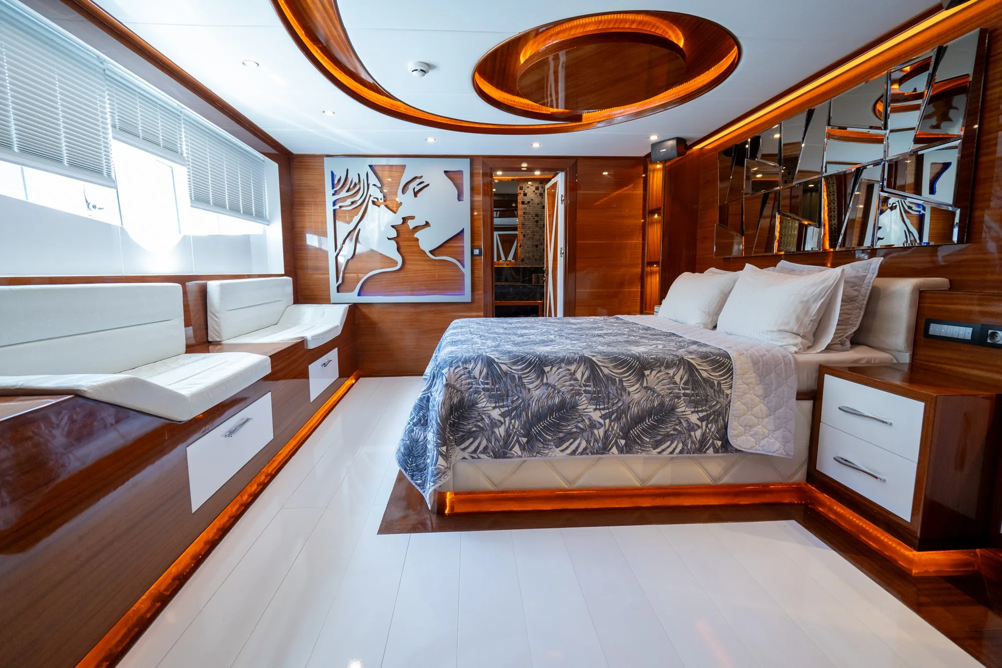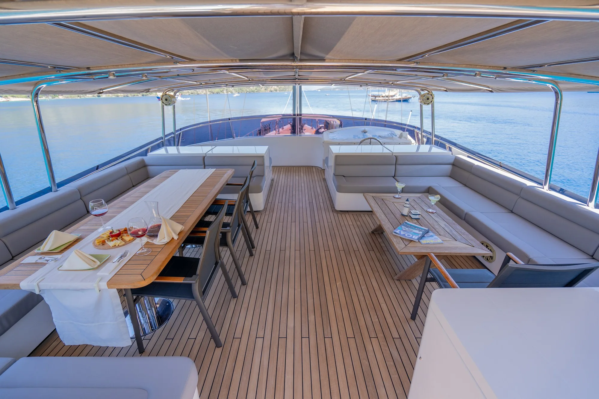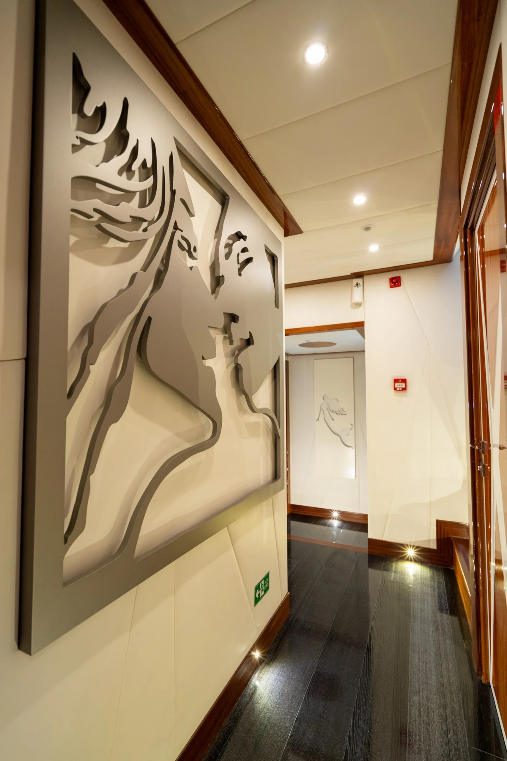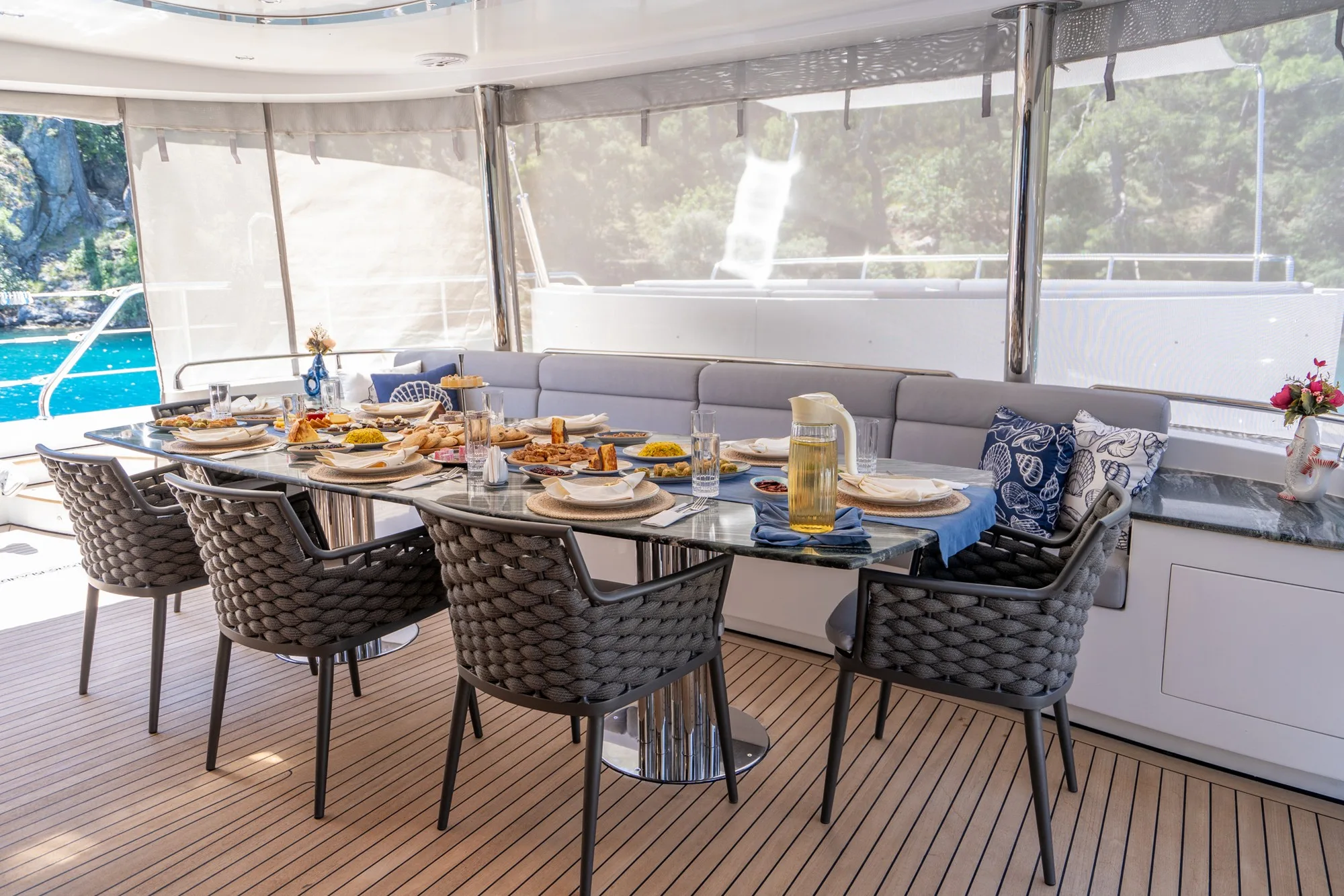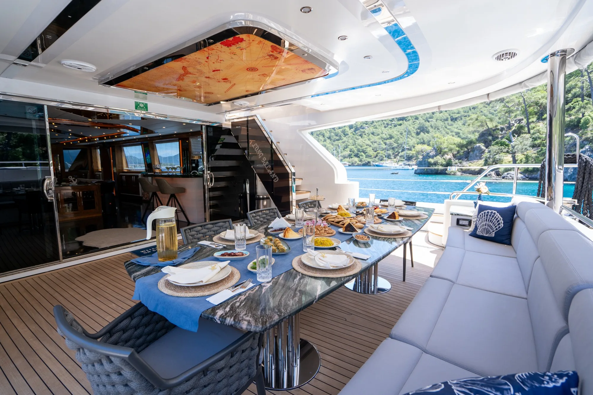 Per le sue caratteristiche questo caicco è un mix tra un caicco e un motoryacht, e può ospitare fino a 10 ospiti in 5 eleganti cabine (1 armatoriale, 3 matrimoniali e 1 con letti singoli)